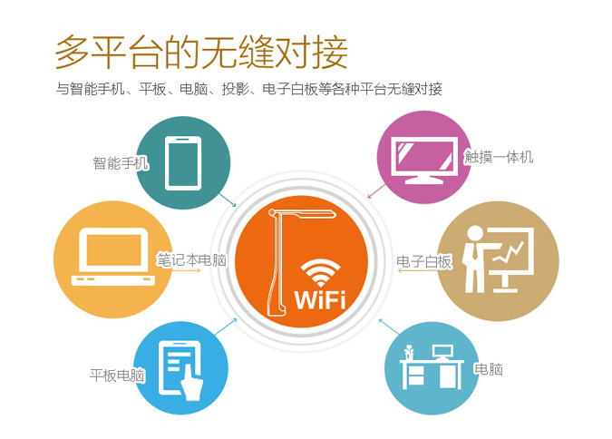 無(wú)線(xiàn)視頻展臺(tái)可以通過(guò)WIFI同步連接到電子白板、一體機(jī)、電腦、筆記本、平板、手機(jī),在課堂上用各種設(shè)備觀看的同時(shí)還可以將老師的教學(xué)過(guò)程錄制下來(lái),隨時(shí)隨地回放視頻,方便學(xué)生溫故知新 。
