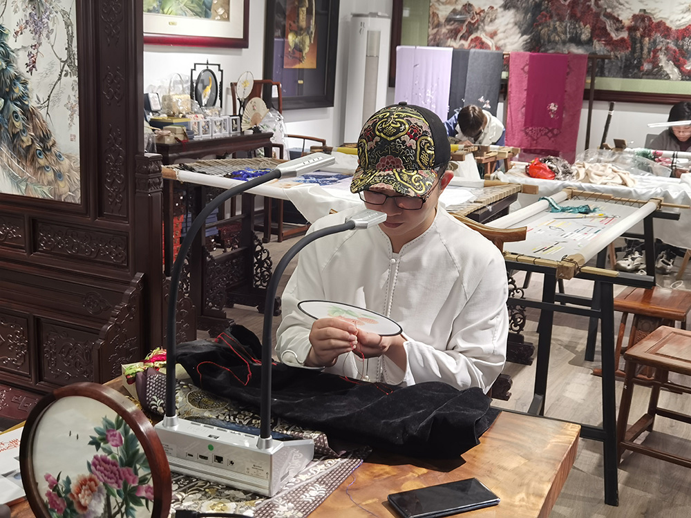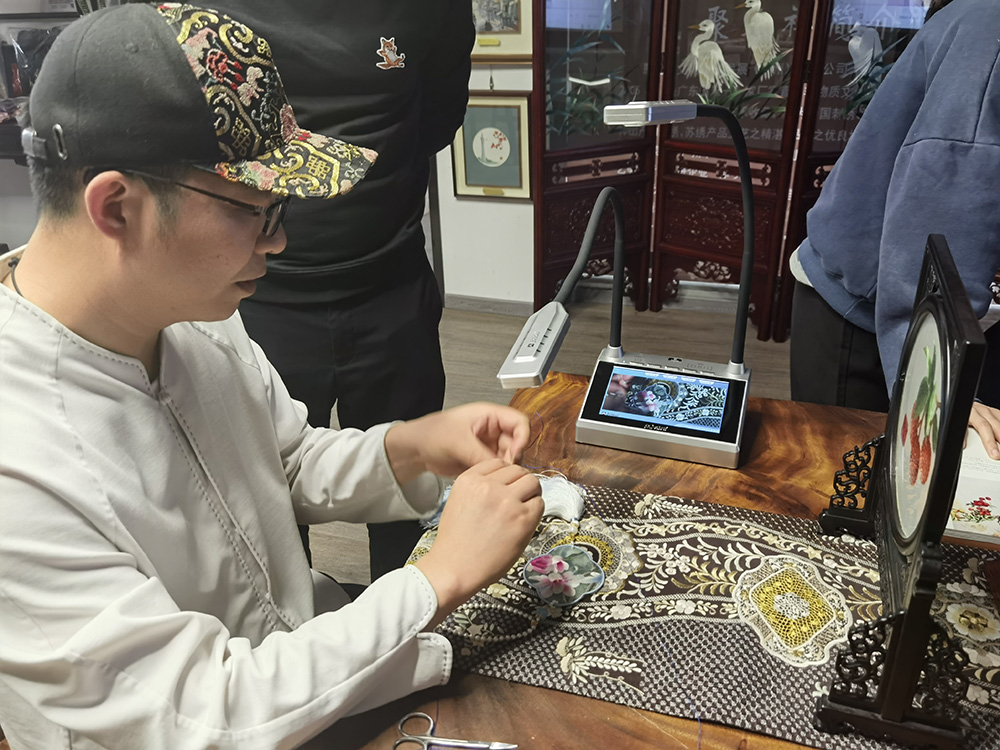 在現場,吉星無線全錄播通過5G傳輸,將王新元大師刺繡的針路、刺繡的手法和技巧實時清晰投放至大屏上。和過往的圍觀教學相比,這樣的教學質量更好、效率更高。